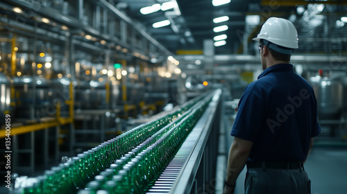 Standing on an elevated catwalk, the safety officer observes a loud and busy bottling plant, conveyor belts transporting glass bottles while machinery hums below