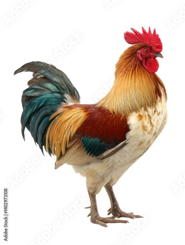 Standing Rooster with Colorful Feathers Isolated on White Background Studio Shot