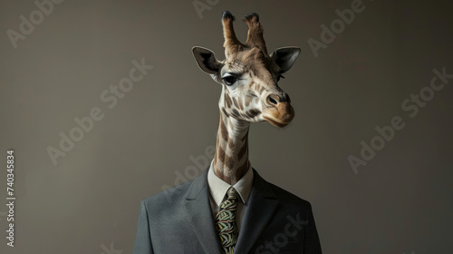 Standing tall in a chic business suit with a trendy leaf-patterned tie, this giraffe showcases a perfect blend of wilderness and urban sophistication.
