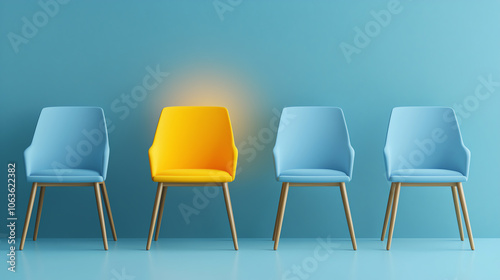 Standout Yellow Chair in Row of Blue Chairs – Business Concept