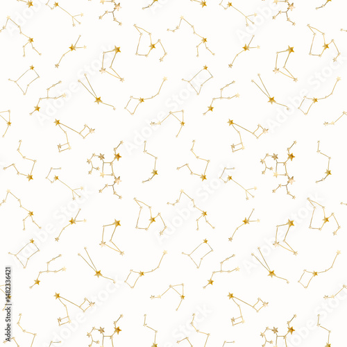 Star constellations in yellow shades. seamless pattern. Watercolor illustration. A number of zodiac constellations are isolated on a white background. The theme of magic, astrology and esotericism