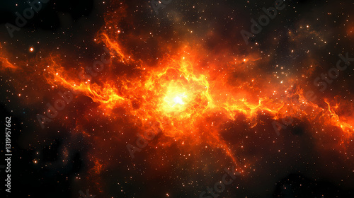 Star explodes with fiery cloud, celestial brilliance against starry space backdrop. Fiery Brilliance. Illustration