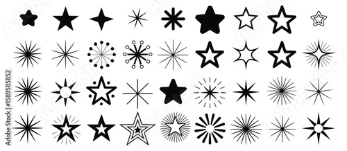 Star silhouettes showcasing solid, outlined, and dotted star shapes in various styles for use in graphic design, decoration, and illustration projects