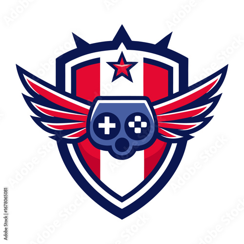 Star-Adorned Esports Shield with Gamepad and Wings in Red-Navy Tones