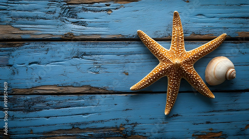 Starfish and seashell on a weathered wooden surface.
