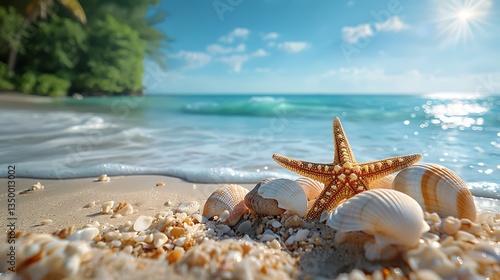 Starfish and seashells on a tranquil beach with gentle waves, surrounded by lush green trees