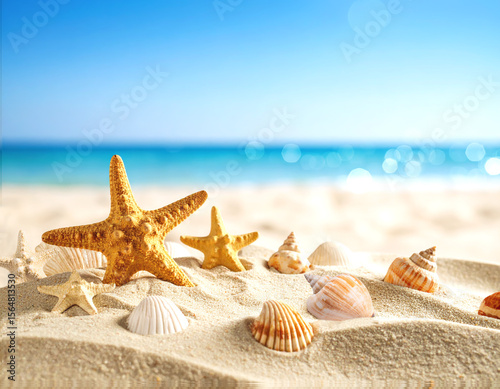 Starfish and Seashells on Sandy Beach with Ocean in Background