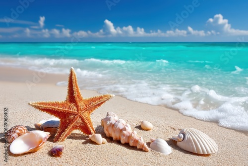 Starfish and seashells rest on a sandy beach with turquoise ocean waves and a bright blue sky in the background