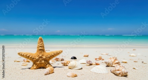 Starfish and shells on a tropical beach under a bright blue sky