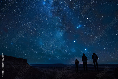 Stargazing Silence. Three silhouettes against a vivid starry sky atop a ridge at night.