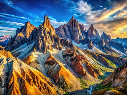 Stark angular peaks pierce a clear blue sky, their sharp ridges etched against a rocky landscape.