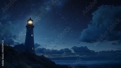 Starry night backdrop with a towering lighthouse, its beacon illuminating the calm and vast sky