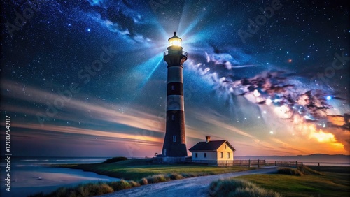 Starry night illuminates Sullivan's Island Lighthouse, its beacon a dramatic contrast to the dark ocean.