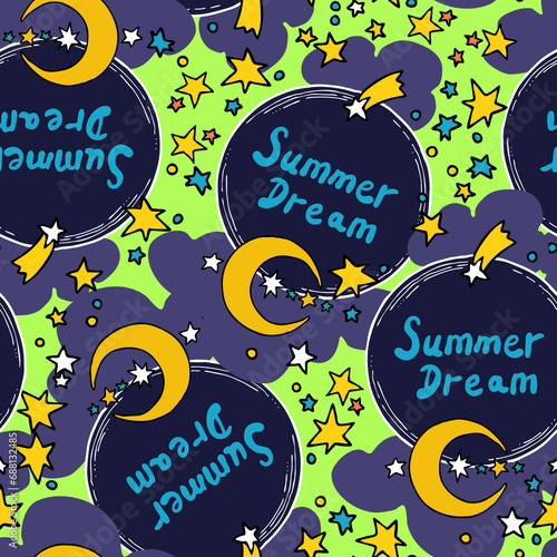 Starry night seamless pattern with moon, stars and clouds. Boho style decorative background for wallpaper, digital paper, wrapping design, fashion fabric, textile print. Hand drawn illustration.
