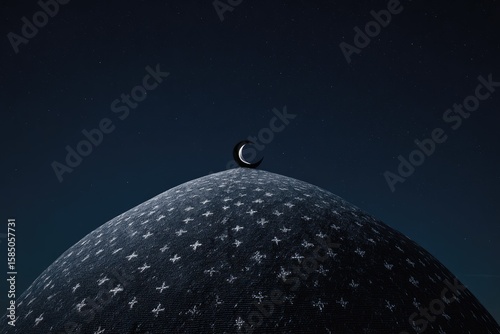 Starry night sky above a dark, patterned dome, topped with a crescent moon