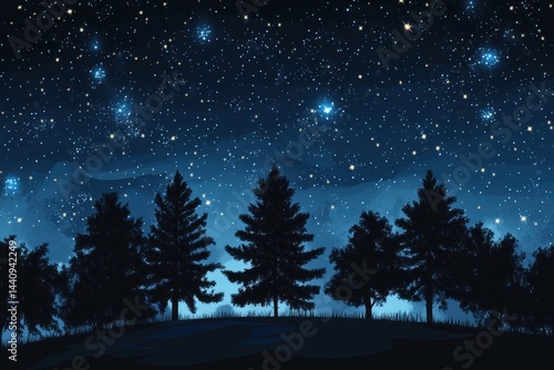 Starry night sky above dark silhouettes of tall trees in a tranquil outdoor setting, Starry night sky over silhouette of trees