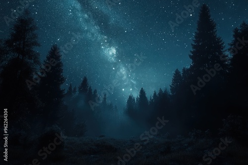 Starry night sky over dark forest.