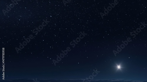 Starry Night Sky View with Bright Star Shining Over Horizon Dark Blue Space Background Astronomy Nightscape