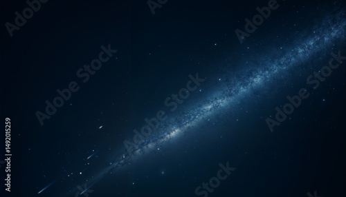 Starry night sky with a bright galaxy and shooting stars in a cosmic atmosphere.
