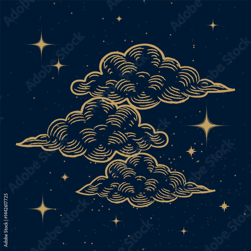 Starry night sky with clouds background. Bright golden stars and clouds wallpaper icons. Space backdrop. Dark Sky with shiny stars. Vector Illustration.