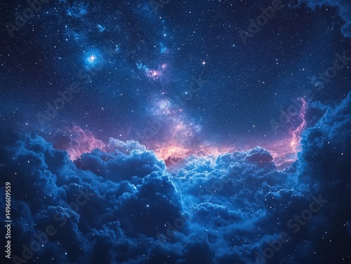 Starry night sky with clouds, panorama, universe filled with stars, nebula and galaxy