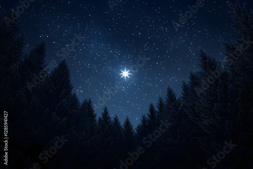 Starry night sky with the bright star of Orion over a forest landscape. Christmas background