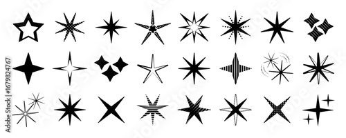 Stars and sparkles black futuristic icon set, vector monochrome sparks sign collection, retro abstract y2k flash symbols, different shining shapes with various patterns