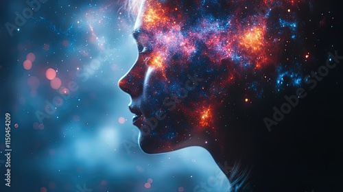 Stars, freedom, and a silhouette of a person with a galaxy. Spiritual healing, awareness, and faith. Nebula, constellation, and abstract light in the universe. Hope, connection, and cosmic mindfulness