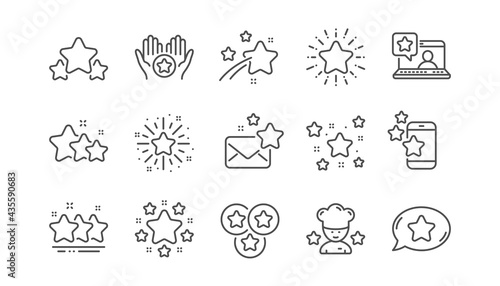 Stars line icons. Night star, Glitter burst and Fireworks. Twinkle stars, Chef award line icons. Favorite bookmark, premium star, ranking rate. Sparkle geometry shape. Linear set. Vector