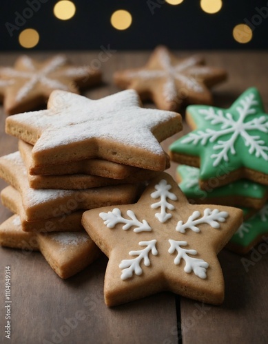 Star-shaped Christmas cookies with icing on rustic table