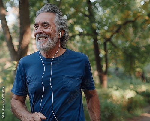 Starszy mężczyzna z siwymi włosami i brodą spaceruje w parku, uśmiechnięty i zadowolony.