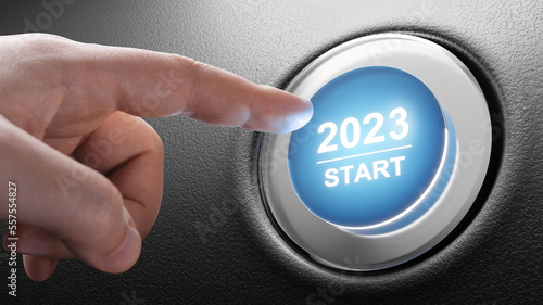 Start 2023. Happy New Year button. 3D illustration