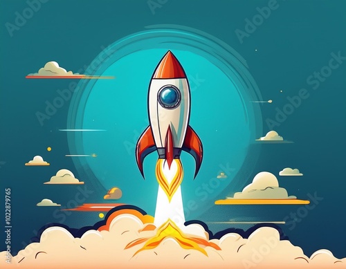 Start up of the space rocket. Rocket ship in flat design on white background.