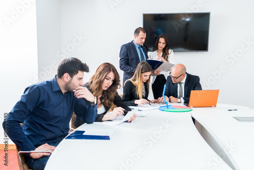 Startup business team on meeting in modern bright office interior mrainstorming. Working on laptop, tablet and with papers.