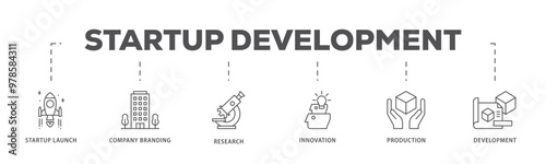 Startup development infographic icon flow process which consists of development, production, innovation, research, company branding, startup launch icon live stroke and easy to edit