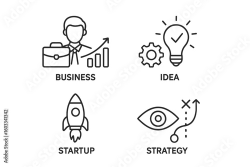 Startup icon set for business development and project launch. Line icons for strategy, innovation, idea generation, and growth. Vector symbols for entrepreneurship.