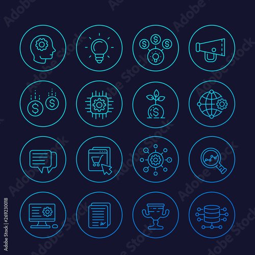 startup icons, creative process, idea, initial capital, e-commerce, line vector