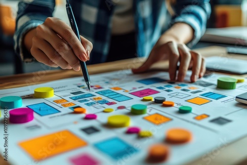 Startup professional highlighting customer acquisition strategies on a flowchart, strategic planning, photo-realistic execution