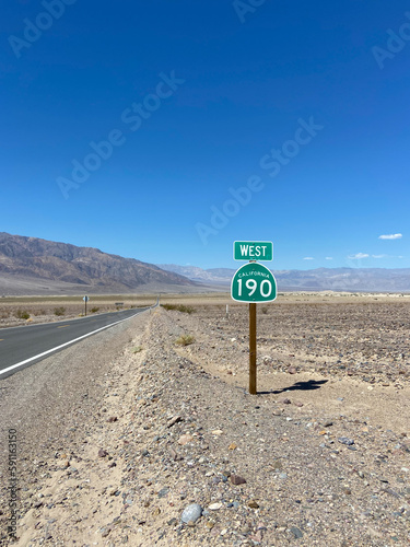 State Route 190 near the Devil's Cornfield area in Death Valley National Park, United States. Empty desert road in Death Valley with clear blue sky and rocky mountains. Information Road Sign.
