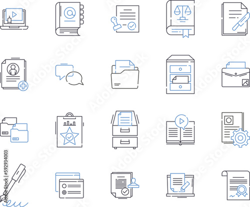 Stationery outline icons collection. Pen, Paper, Notebook, Pencil, Eraser, Crayon, Ruler vector and illustration concept set. Stapler, Scissors, Glue linear signs