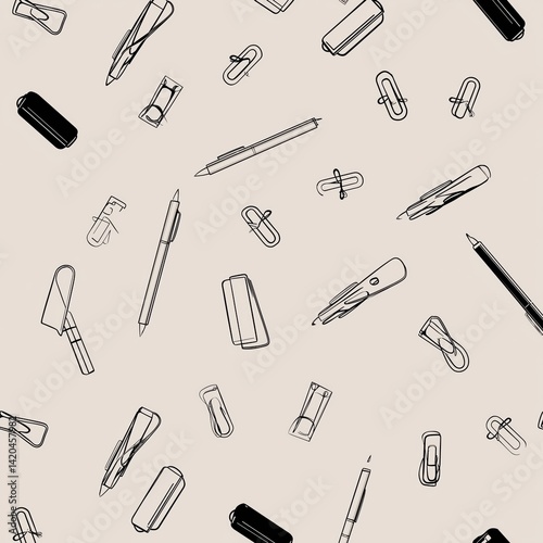 Stationery Supplies Seamless Pattern in Minimal Line Art Style
