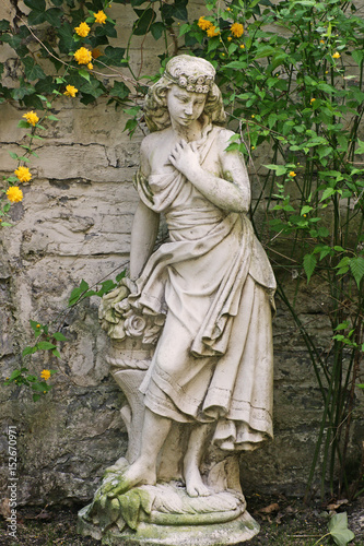 Statue eines Maedchens aus Stein auf einem Sockel vor einer Mauer