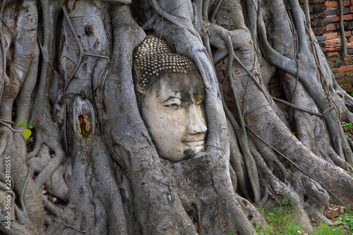 Statue head Buddha in root tree in Wat Mahathat Ayutthaya Thailand