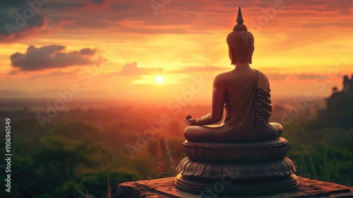 Statue of a Buddha sitting on a hillside with a sunset in the background. Concept of peace and tranquility