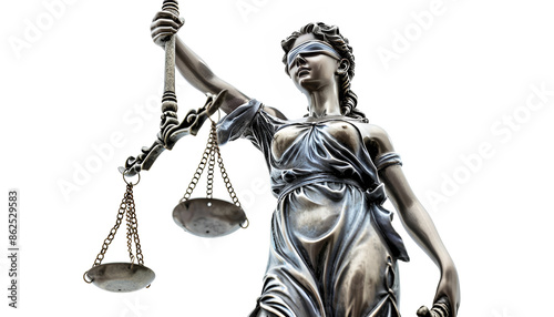 Statue of Lady Justice isolated on white, low angle view. Symbol of fair treatment under law