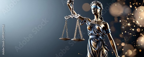Statue of Lady Justice with scales, integrated with cybernetic elements and digital particles