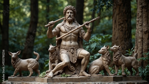 Statue of Pan, the god of the forest, holding a shepherd's flute and surrounded by dancing animals, with dense woods and streams in the background, carvings reflecting his musical talent and harmony w
