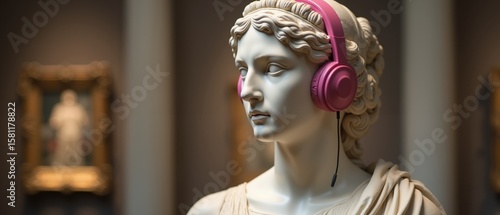 Statue wearing pink headphones in art gallery with soft lighting creating a modern contrast