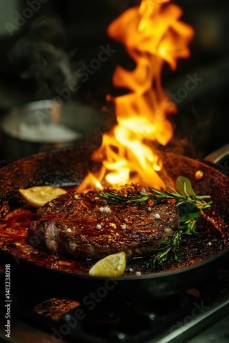 Steak searing on hot skillet flames, creating juicy sizzle.