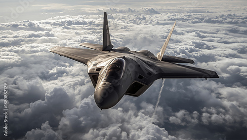 Stealth fighter jet soaring above dense cloud layers, sleek aerodynamic design with sharp angles and matte gray finish, cockpit canopy reflecting sunlight, dramatic sky backdrop with towering clouds,